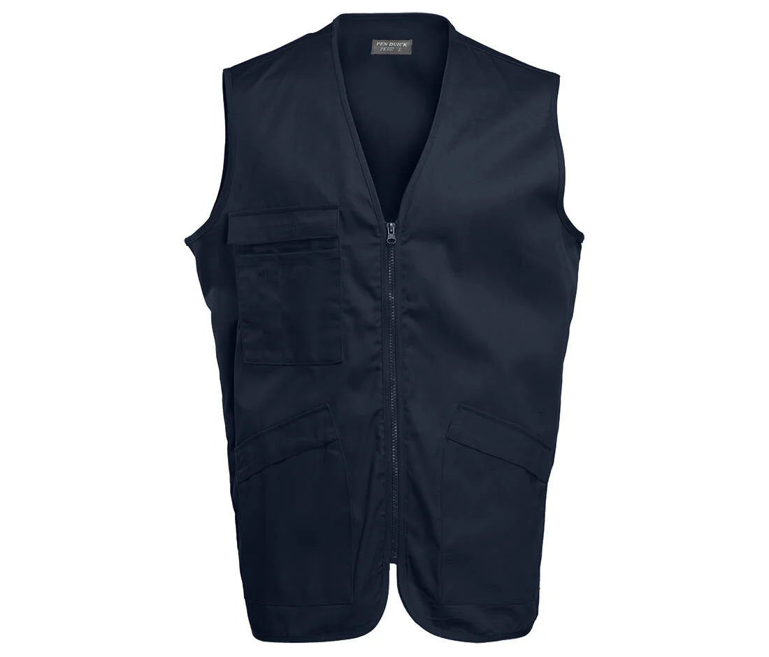 Gilet multi-poches : 6 poches dont 2 poches pour stylos, 1 poche double côté droit et 2 poches plaquées avec rabat. Absence de poche cœur pour le marquage.