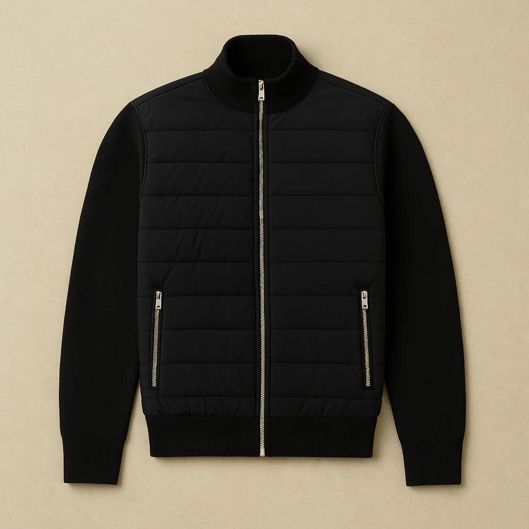 Ce blouson hybride combine l’apparence du tricot avec la fonctionnalité d’une couche extérieure légèrement matelassée. L’avant structuré apporte chaleur et forme, tandis que les manches et le dos tricotés offrent confort et liberté de mouvement. Son design épuré facilite le port en superposition, aussi bien sur un t-shirt que sous un manteau, adapté à diverses situations quotidiennes.