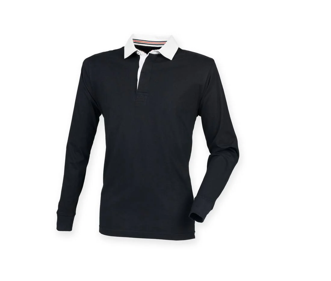 Polo rugby traditionnel sans étiquette de marque. Finition peau de pêche. Double surpiqûre. Fentes latérales. Boutons ton sur ton.