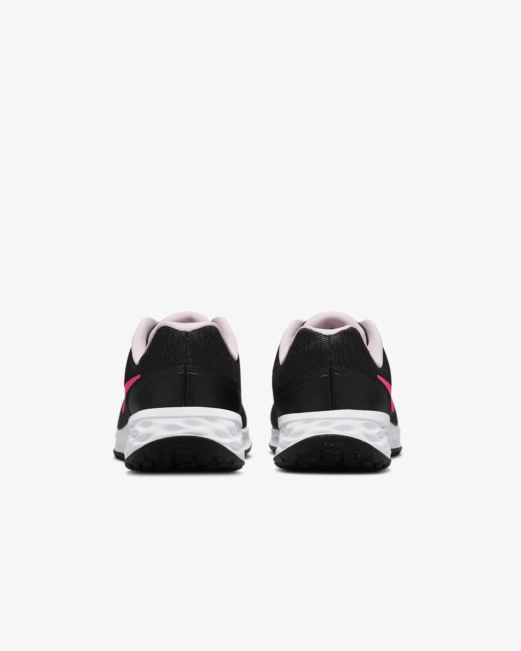 Chaussures lacées pour filles Nike Révolution 6. Dessus en tissu maillé avec semelle extérieure en caoutchouc. Disponible en deux couleurs (noir et noir-rose).