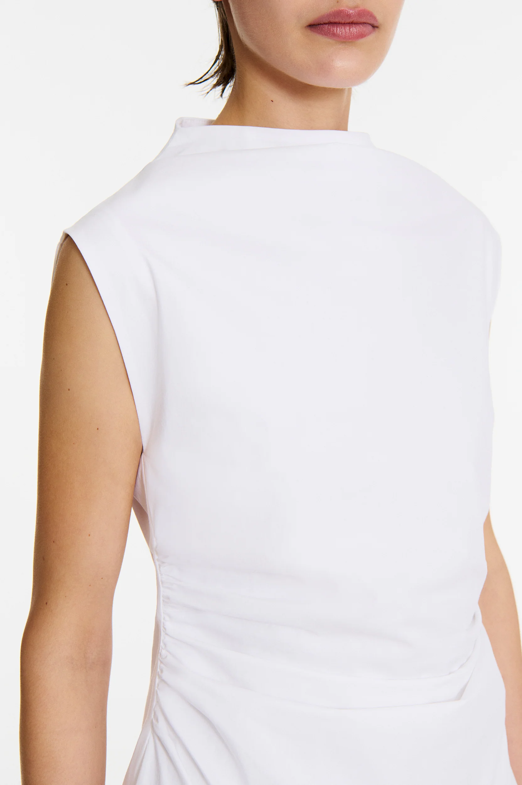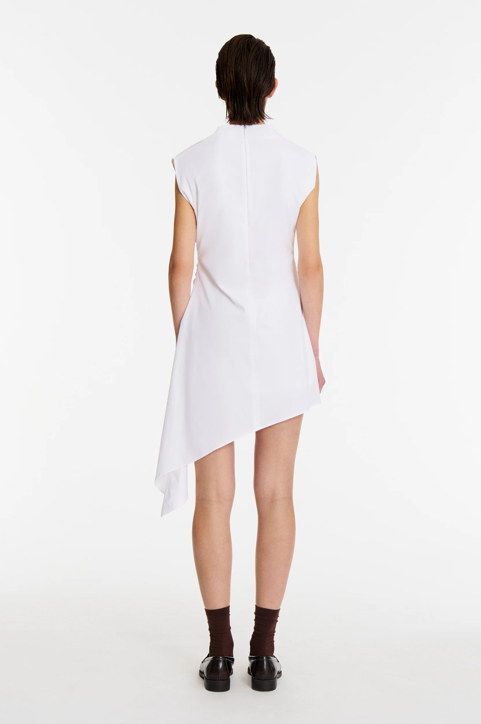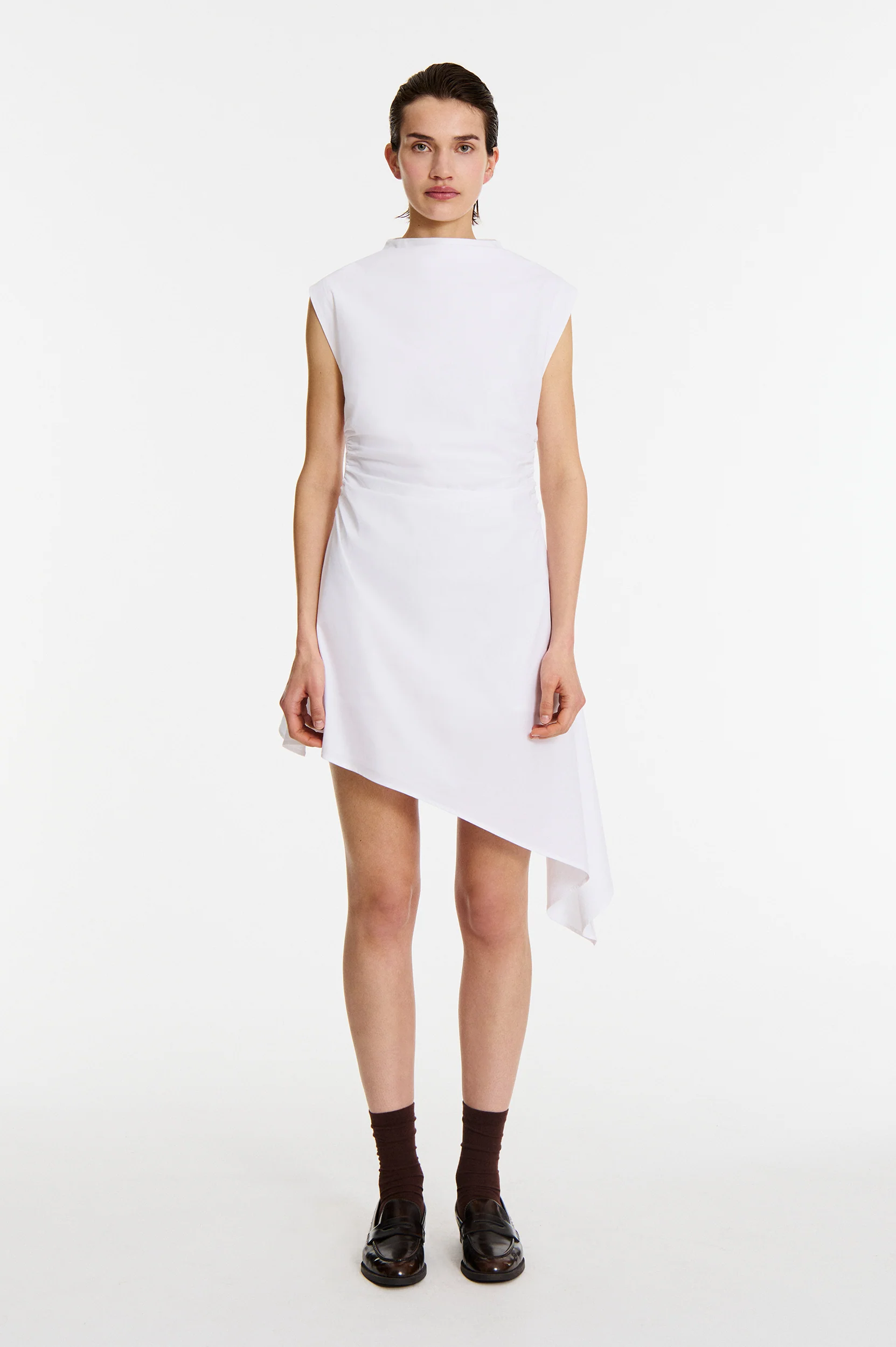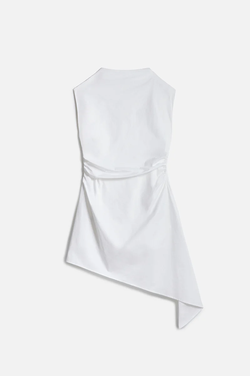 • Robe asymétrique semi-ajustée à la taille avec fronces