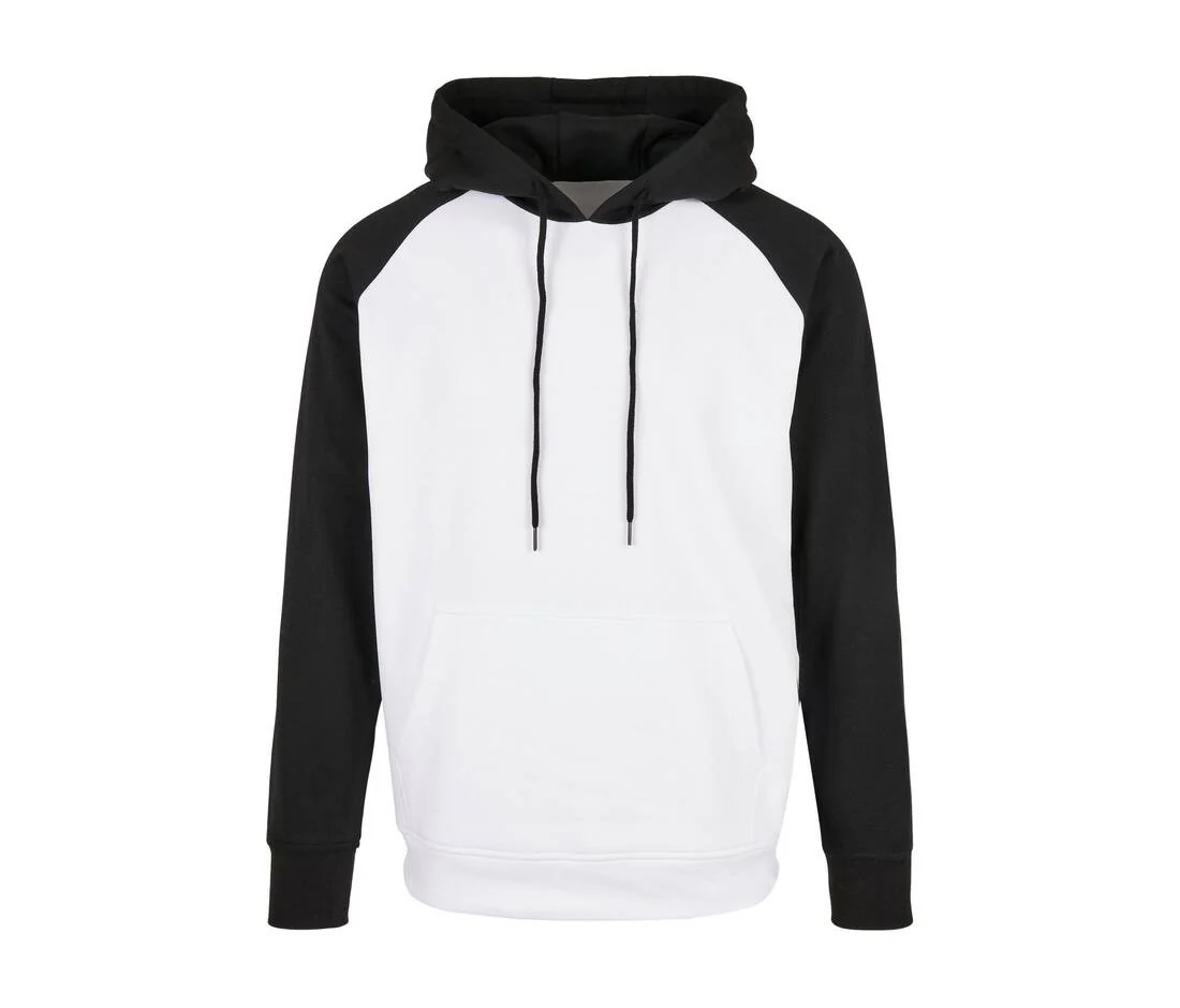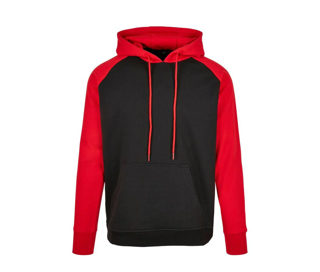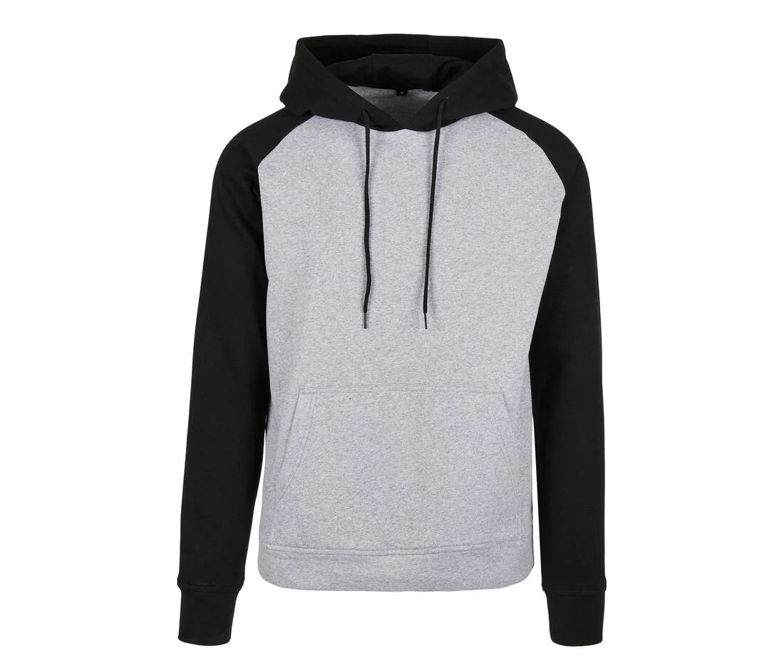 Manches raglan. Intérieur gratté. Capuche et manches contrastées. Capuche ajustable. Poche kangourou. Puce de taille au col.