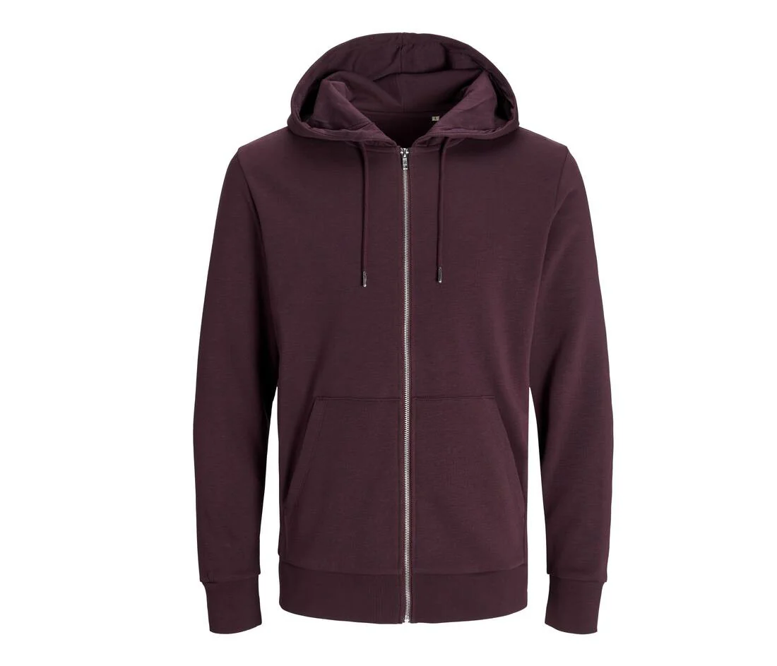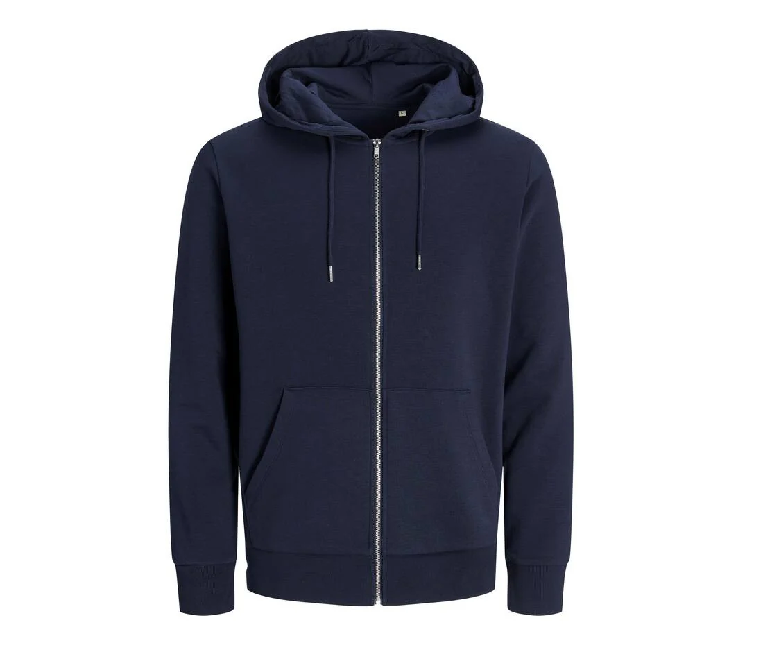 Fermeture zippée métallique. Capuche avec cordon de serrage aux embouts en métal. Poche kangourou.