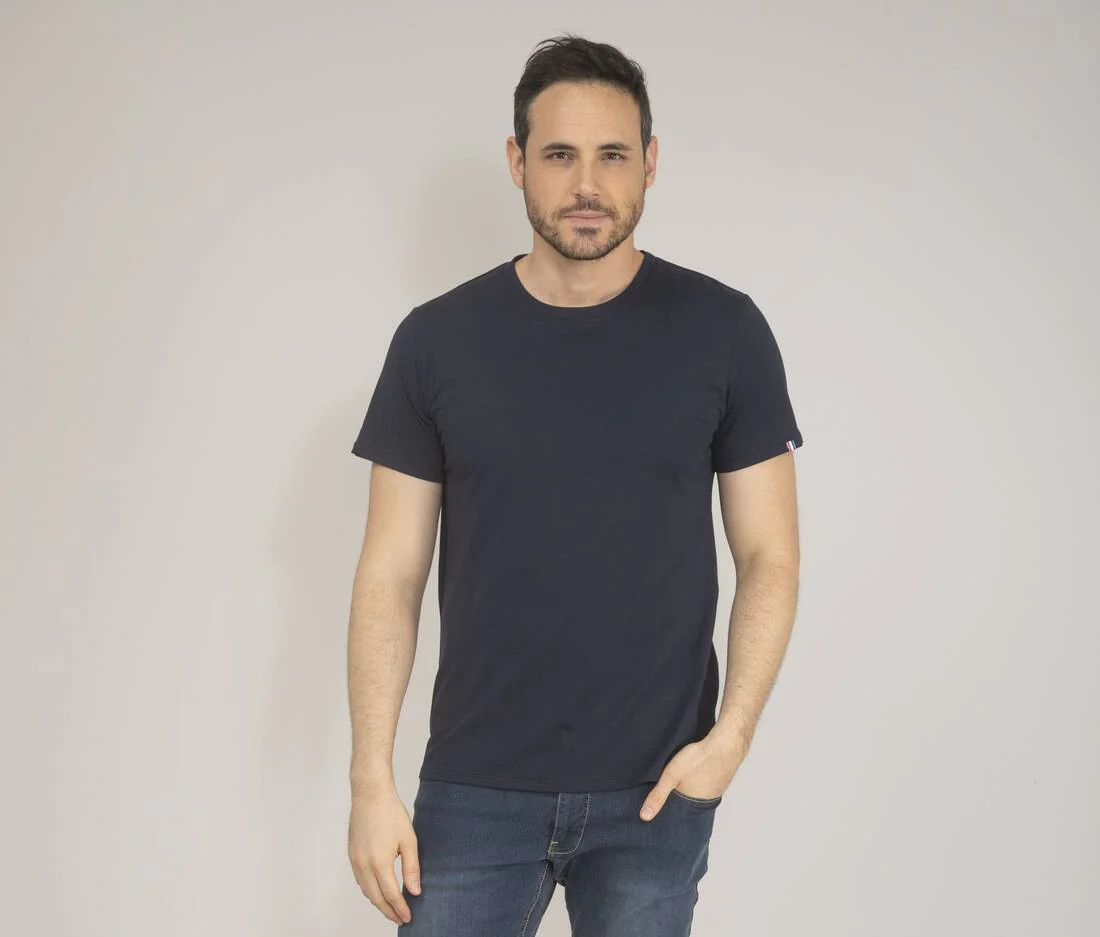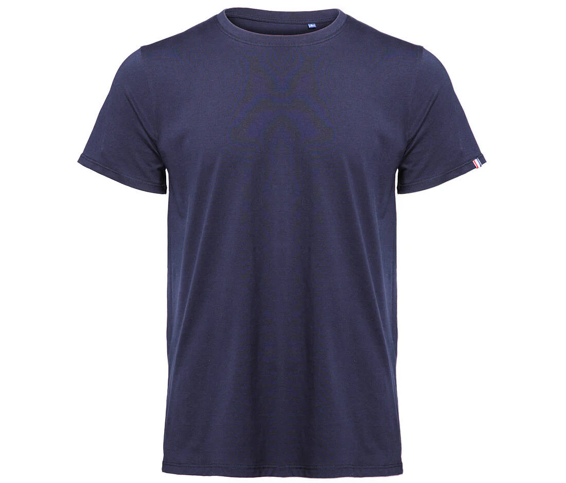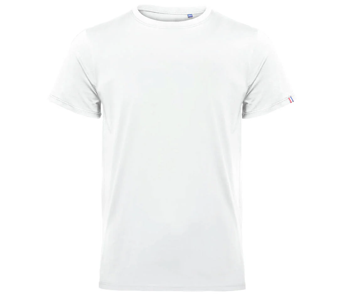 Coupe cintrée. Col rond. Pas d’étiquette de marque, seulement une puce de taille au col. Composition cousue dans la couture intérieure latérale gauche. Coton peigné de belle qualité. Bande de propreté au col. Double surpiqure bas et manches. Drapeau tricolore sur la manche. Origine France garantie.