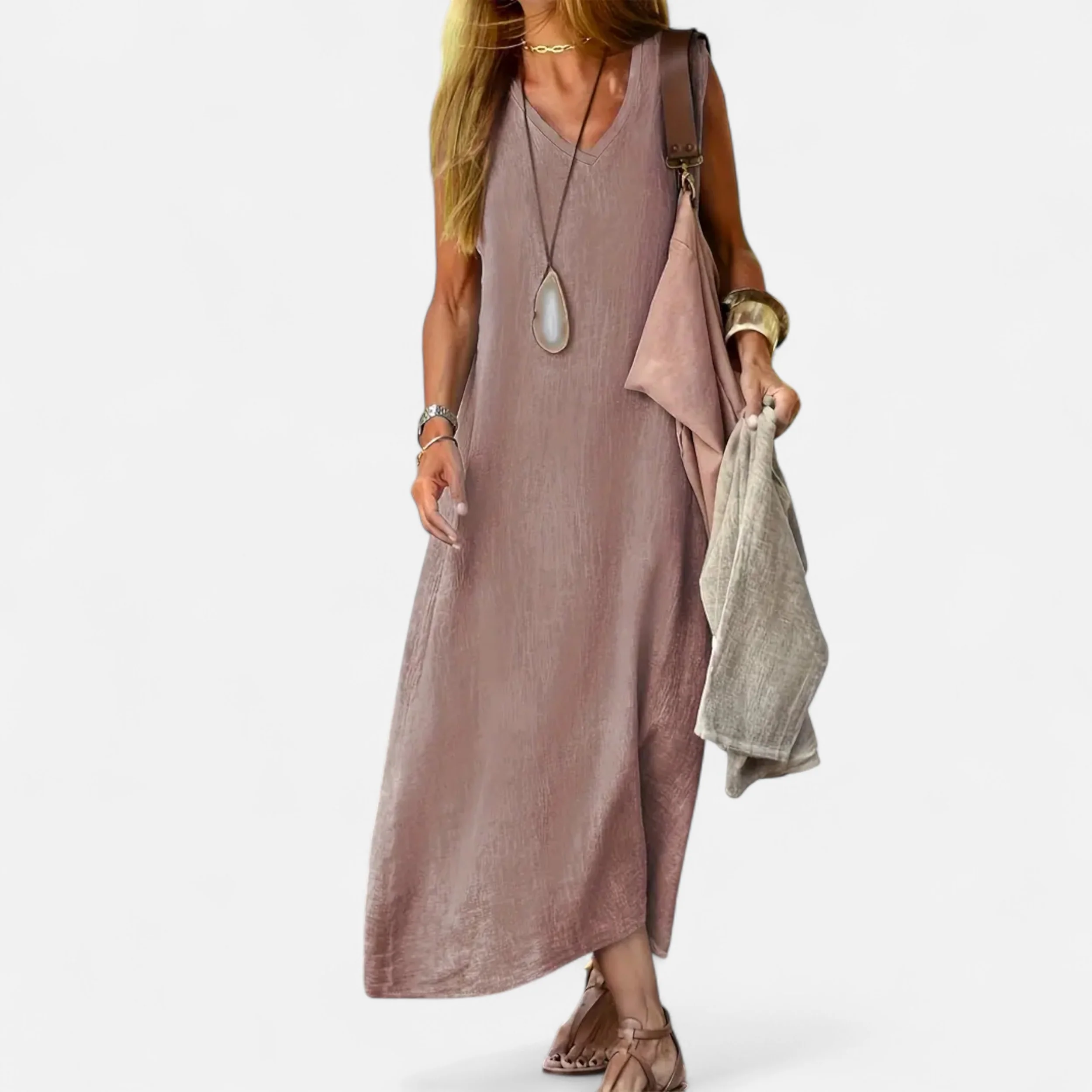 La robe sans manches à col V Velqlo est conçue pour apporter une élégance naturelle au style de tous les jours. Grâce à son tissu fluide et sa coupe évasée, elle offre une silhouette flatteuse qui allie élégance intemporelle et confort décontracté.