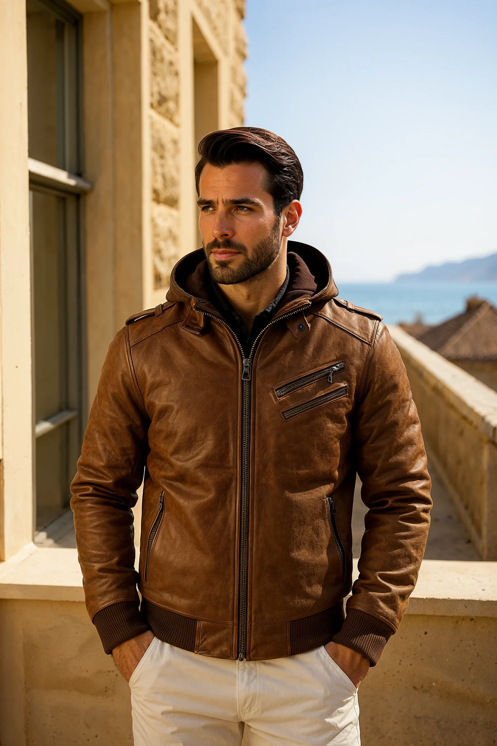 Vespasiano – Veste en Cuir Marron pour Hommes avec Capuche – Veste Biker Vintage avec Poches Zippées et Doublure Chaleureuse