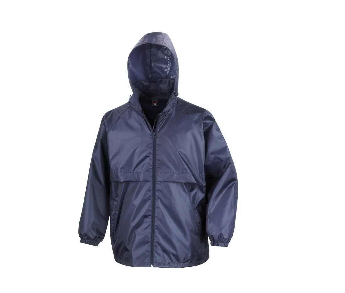 Déperlant. Capuche dans le col avec réglage. 2 poches zippées avant. Poignets élastiqués. Accès marquage.
