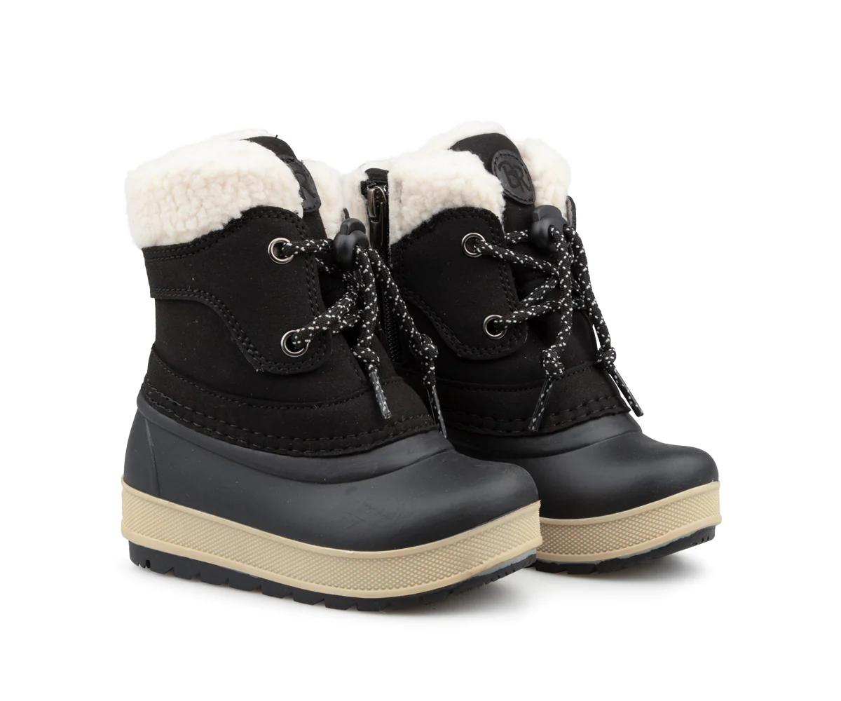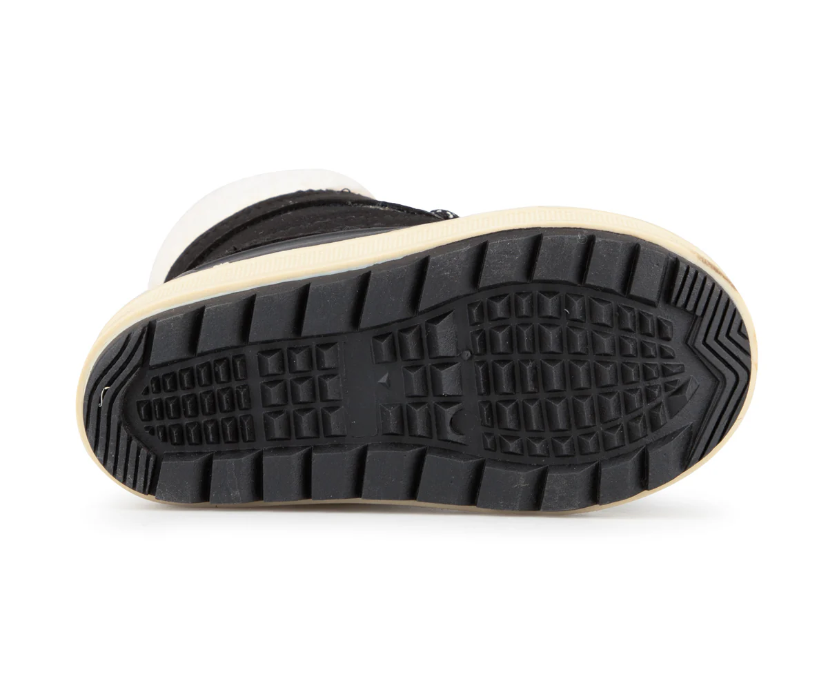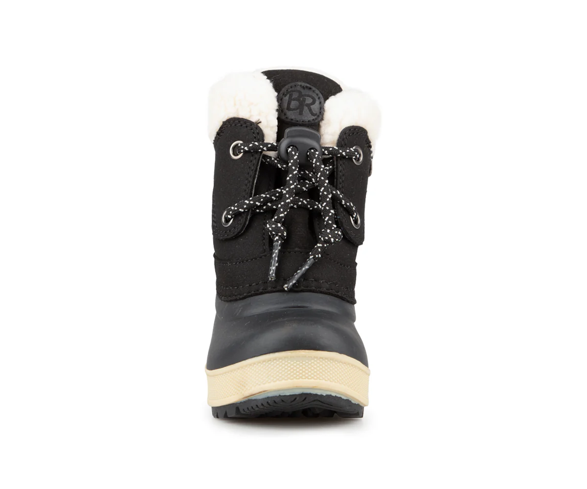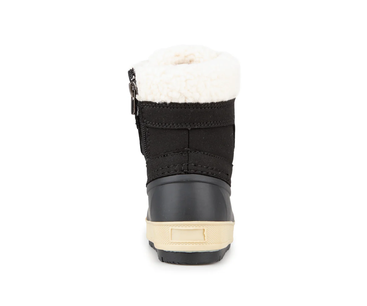 Bottillon pour enfants conçu pour affronter le froid et l’humidité. Sa tige en nylon et cuir synthétique bénéficie d’un traitement imperméable pour garder les pieds secs. Facile à enfiler grâce à la fermeture éclair intérieure et aux lacets élastiques avec togo pour un ajustement sécurisé. La doublure en sherpa offre chaleur et confort, tandis que la semelle extérieure en TPR assure adhérence et durabilité sur toutes les surfaces.