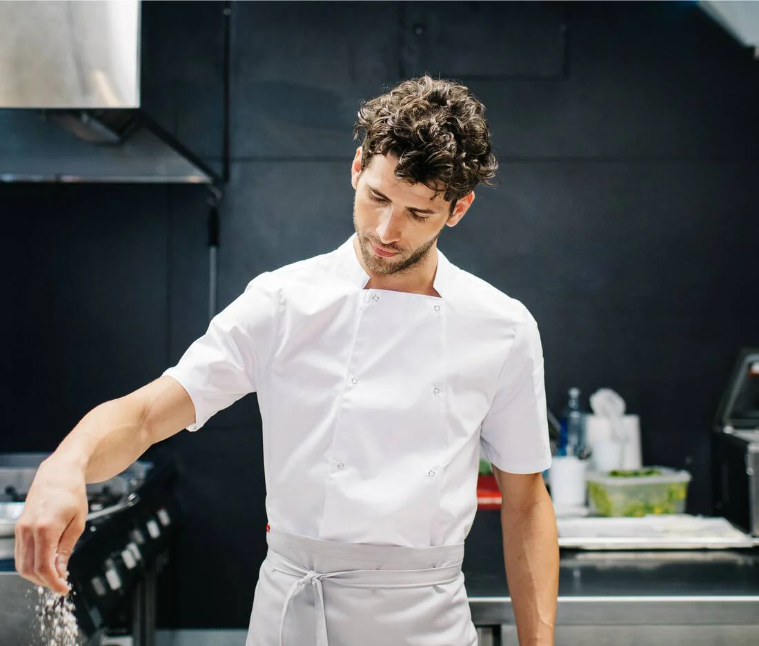Fermeture boutons pression double boutonnage. Col officier. Sans couture latérale. Poche sur la manche gauche.