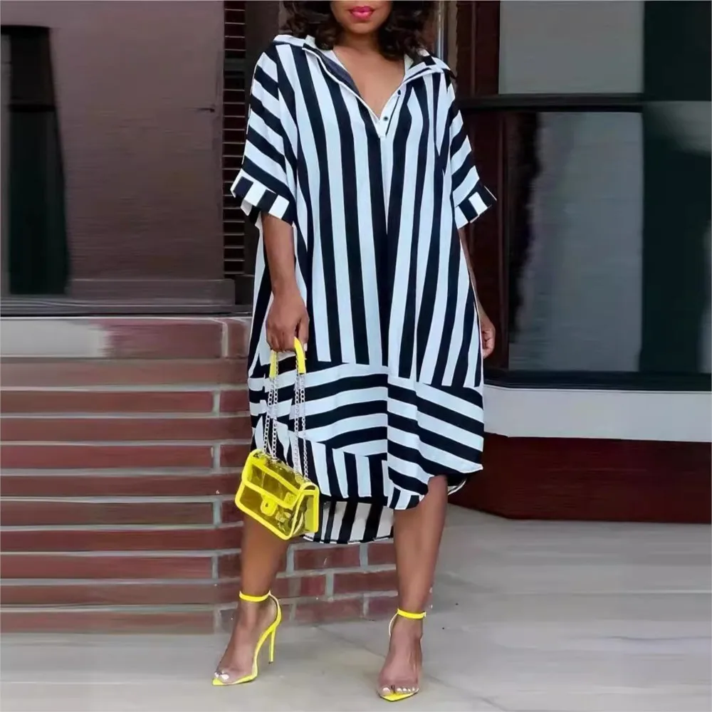 Adoptez un style estival avec la robe chemise Chloé, une pièce légère et fluide parfaite pour les journées ensoleillées. Son imprimé rayé intemporel, ses manches courtes confortables, et sa coupe ample offrent une allure décontractée tout en restant élégante. Facile à porter, cette robe polyvalente s’adapte aussi bien à une tenue de plage qu’à une sortie en ville.