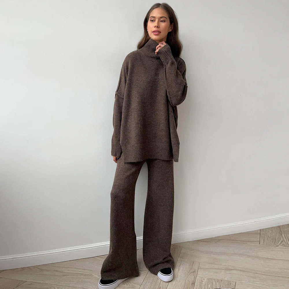 Plongez dans un univers où confort et tendance se rencontrent avec cet ensemble deux pièces. Composé d’un pull ample à col roulé et d’un pantalon à la coupe moderne, ce set est parfait pour un look casual chic en toute occasion. Il allie style et praticité.