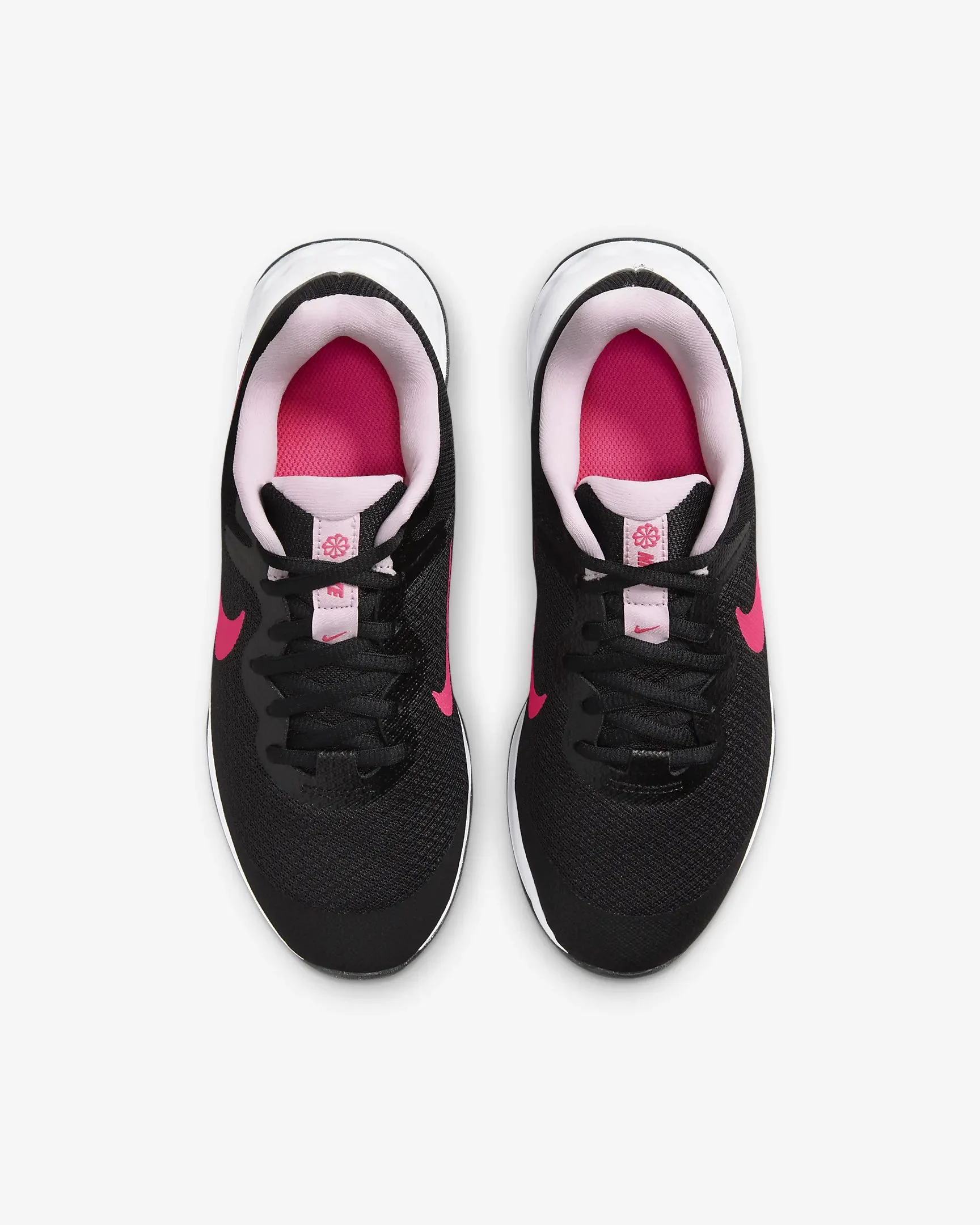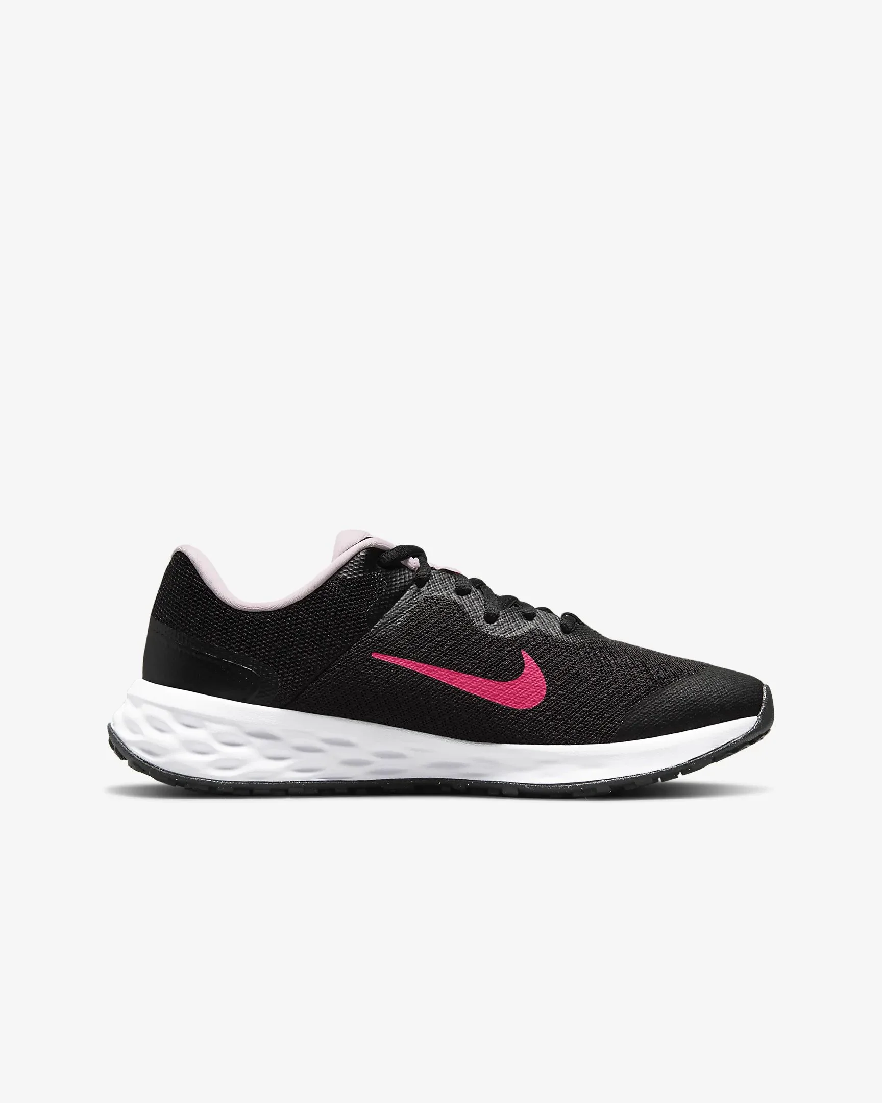 Chaussures lacées pour filles Nike Révolution 6. Dessus en tissu maillé avec semelle extérieure en caoutchouc. Disponible en deux couleurs (noir et noir-rose).