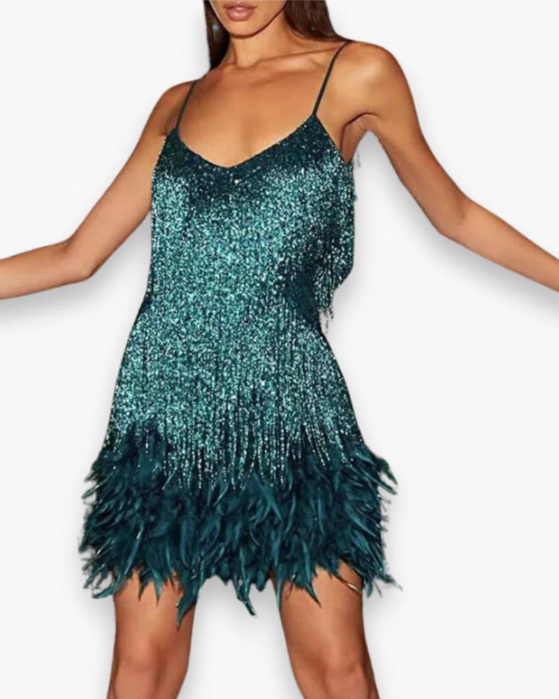 Faites tourner les têtes avec cette robe de soirée à franges, parfaite pour les occasions festives où vous souhaitez briller. Son design inspiré des années folles apporte mouvement, élégance et une touche rétro irrésistible.