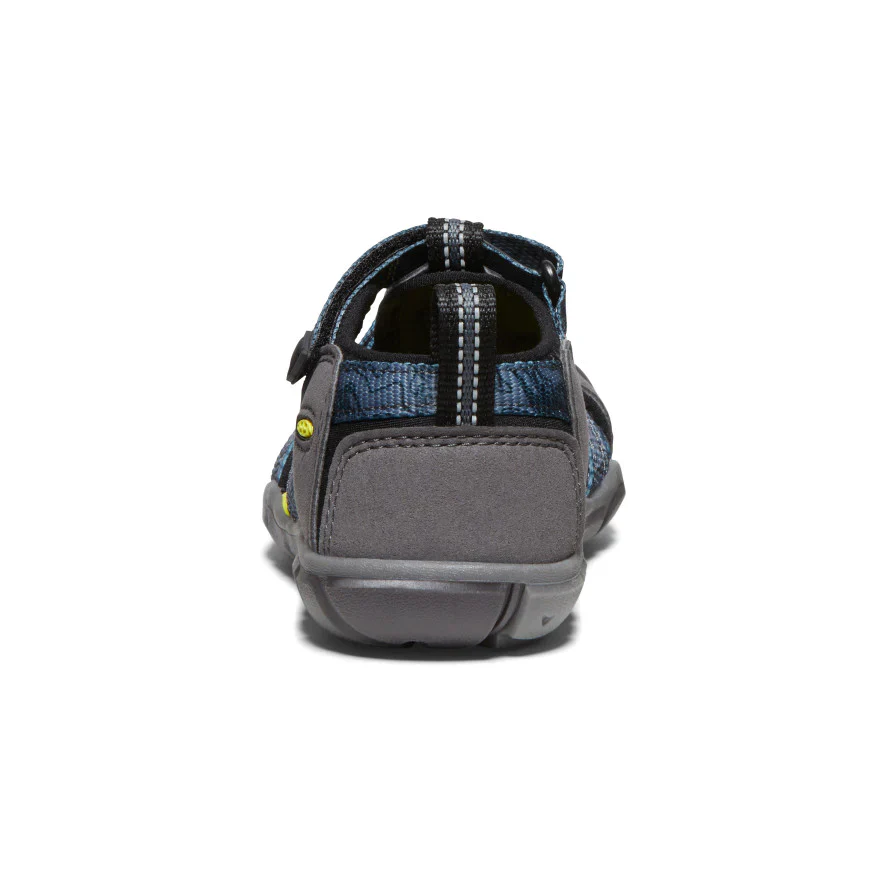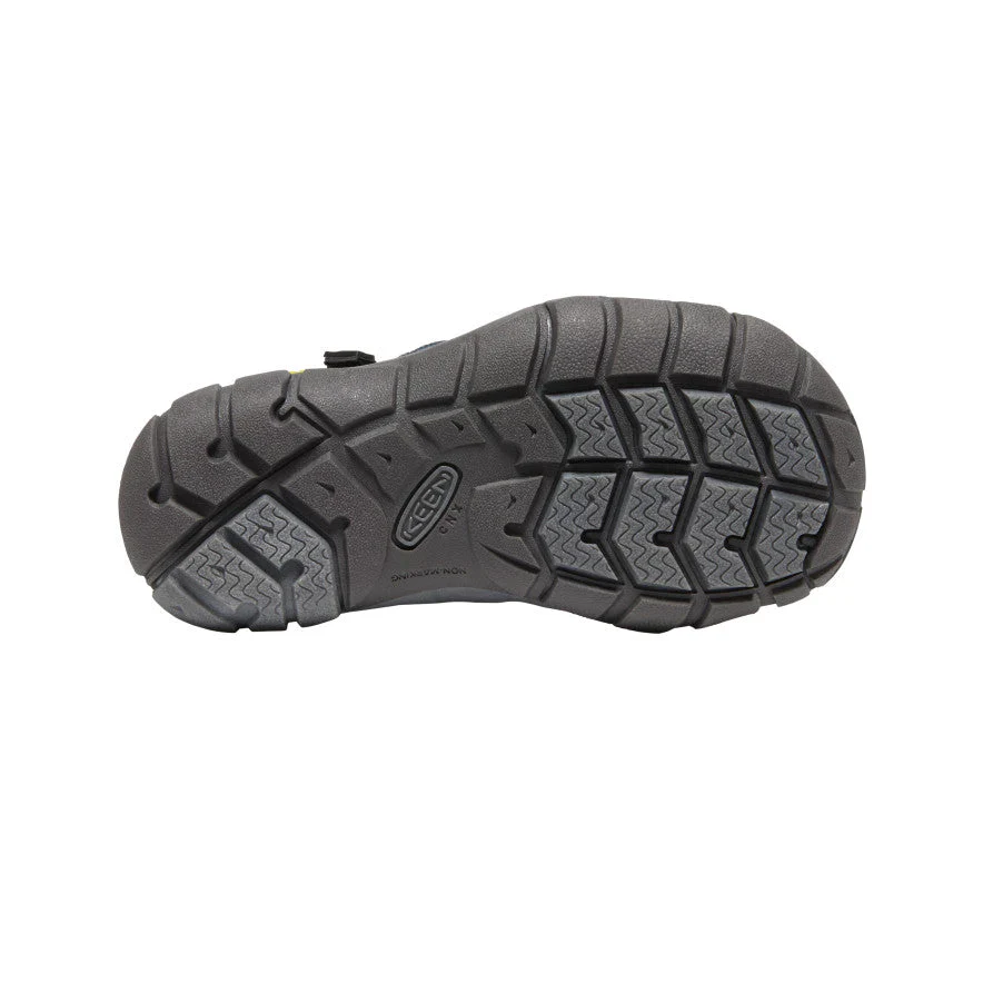 Sandale à bout fermé Keen Seacamp II pour garçons qui aime bouger. Les sangles sont en polyester lavable, les élastiques bungee permettent un ajustement facile et rapide et la doublure sèche rapidement. La semelle intérieure en EVA pour un super confort et la semelle extérieure à crampons pour une bonne adhérence. Disponible dans la teinte de bleue.