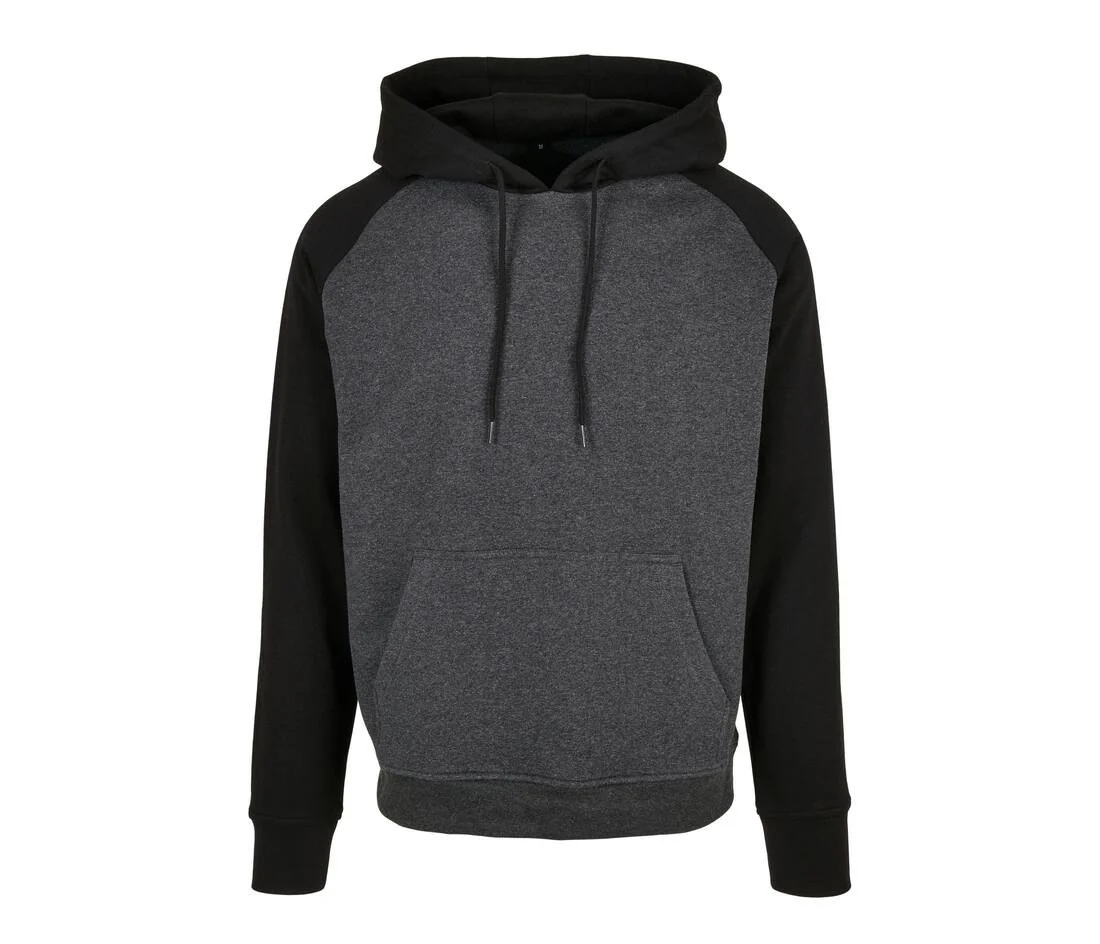 Manches raglan. Intérieur gratté. Capuche et manches contrastées. Capuche ajustable. Poche kangourou. Puce de taille au col.