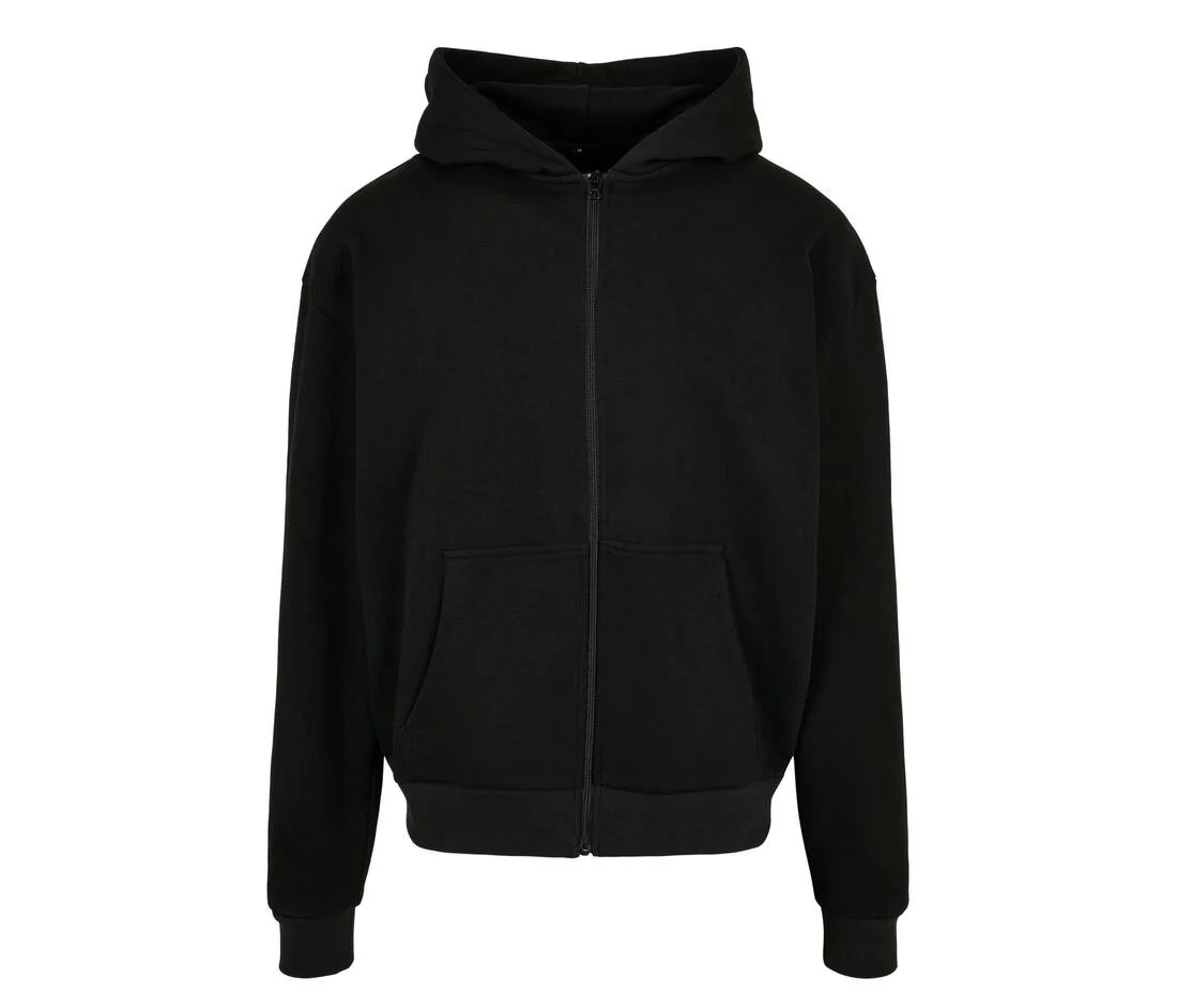 Fermeture grand zip métallique. Bords côte épais aux poignets et à la taille. Capuche classique mais sans cordon. Poches kangourou. Coupe large. Intérieur French Terry.