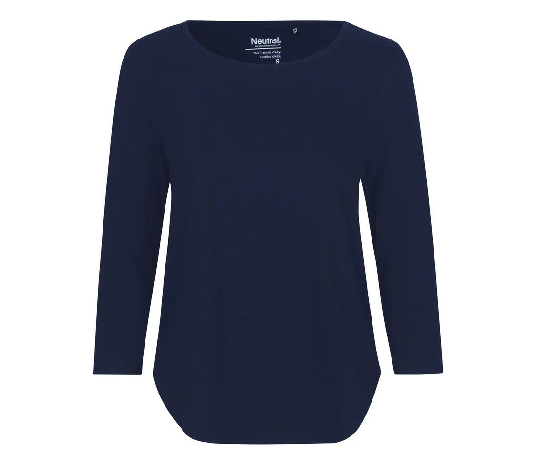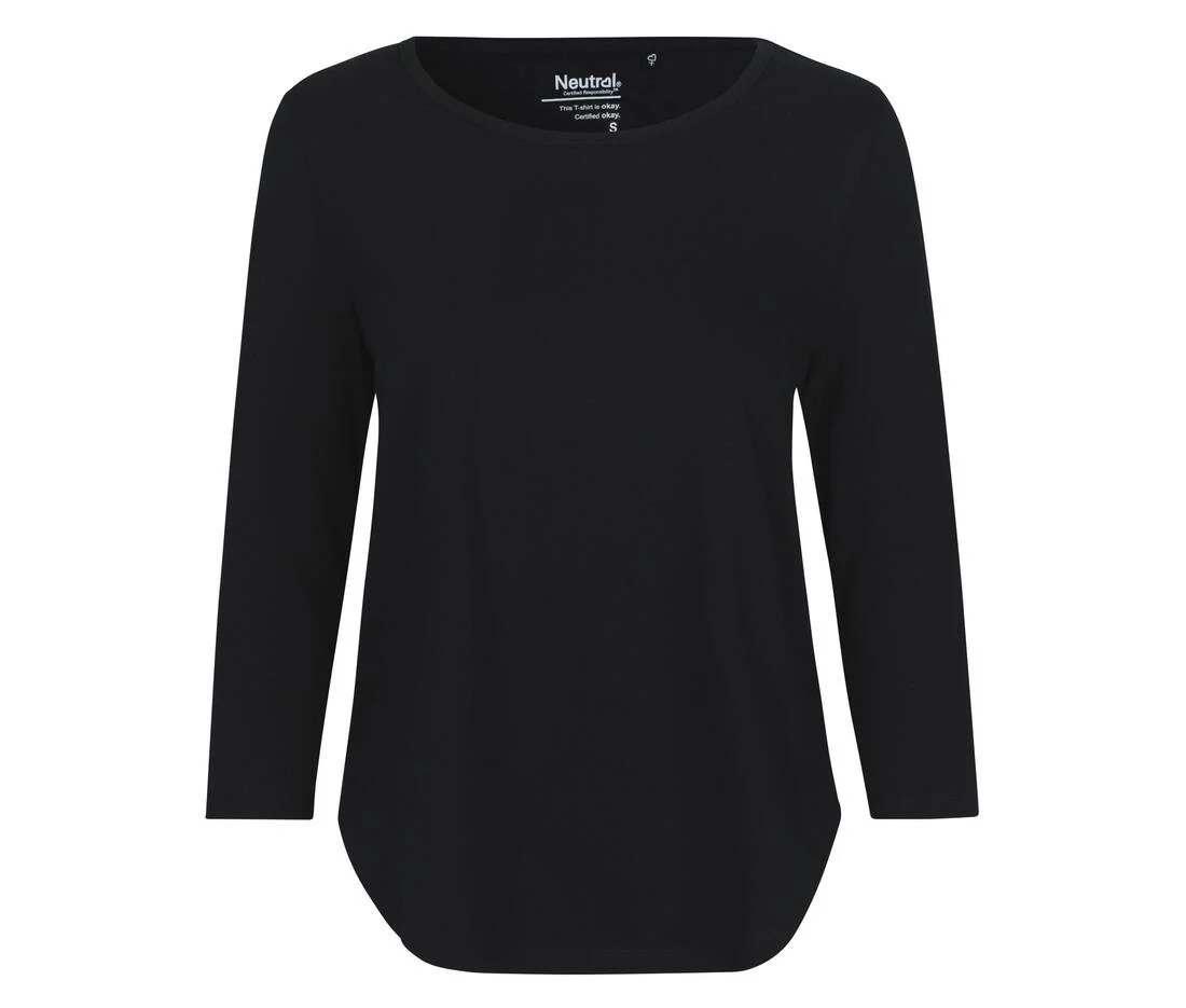 Tee-shirt femme manches 3/4. Col en bords côte avec Lycra®. Bande de propreté au col. Certifié Fairtrade, EU Ecolabel, SA8000 et Oekotex. Produit avec de l’énergie éolienne.