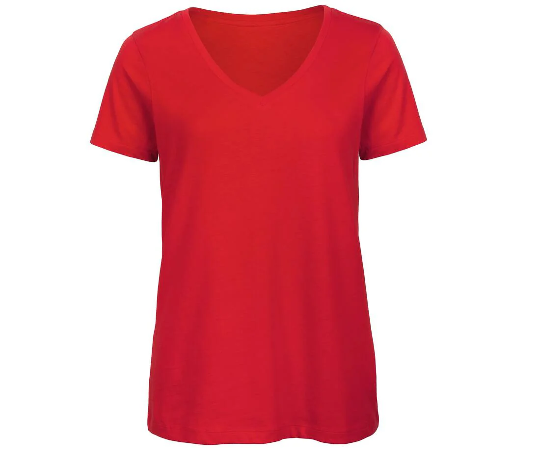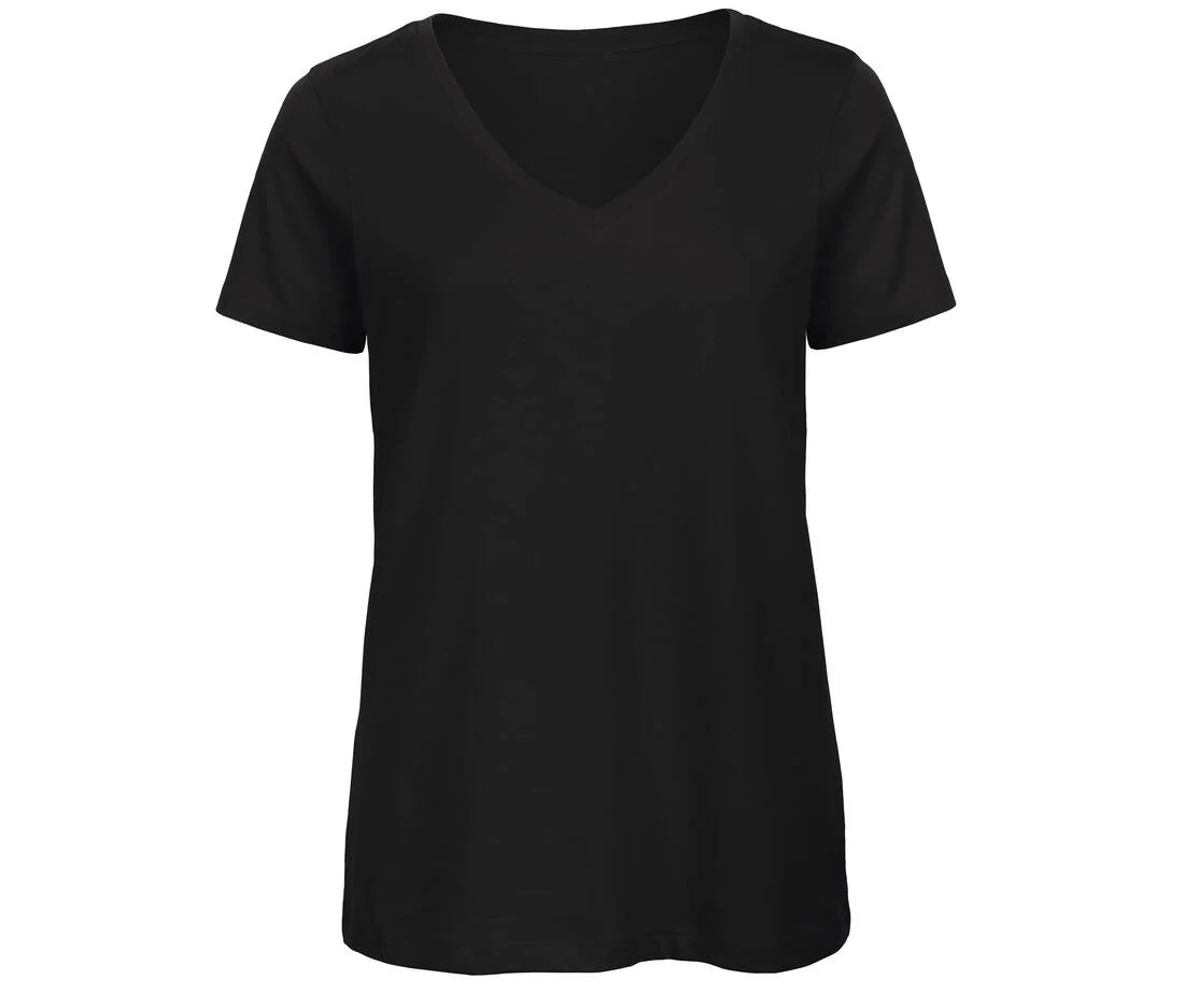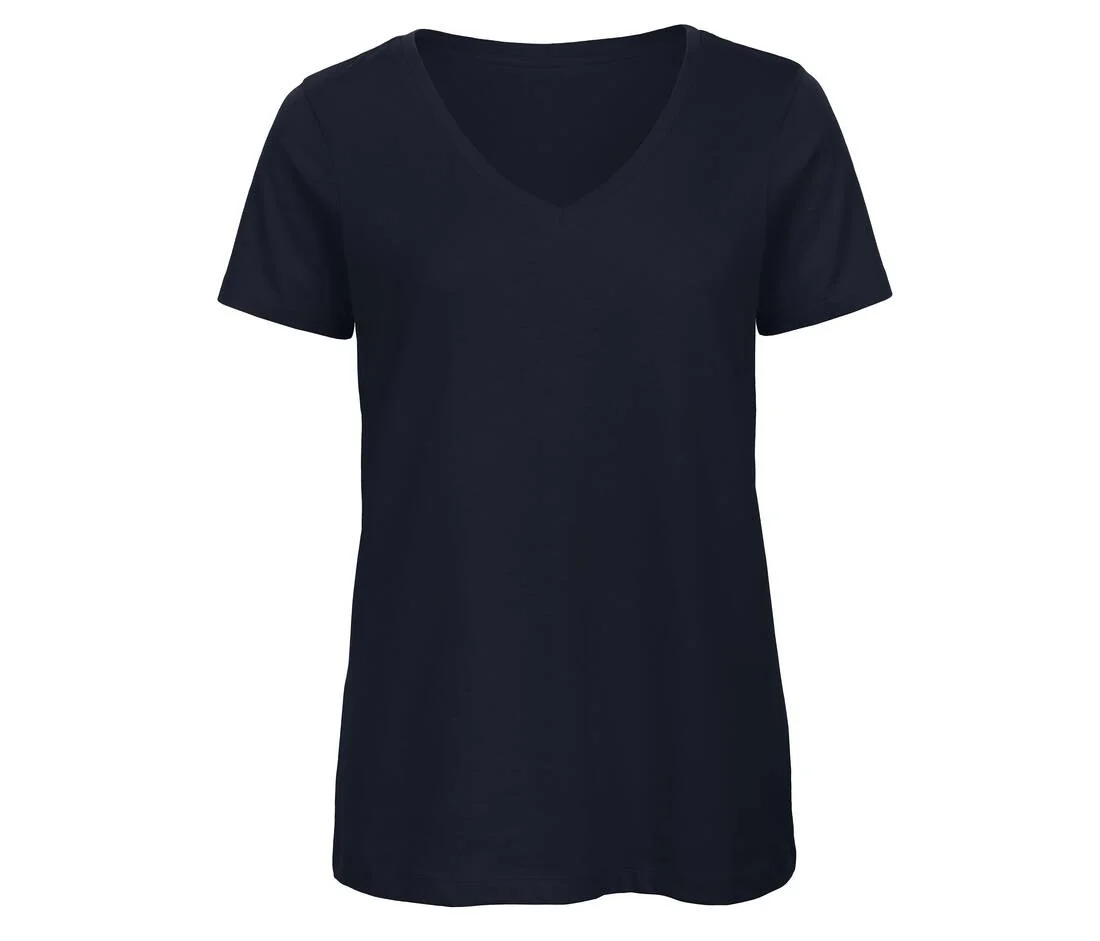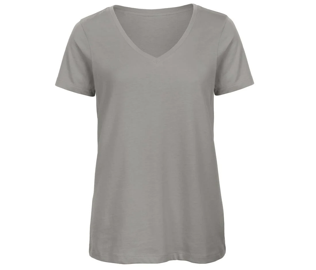 Tee-shirt femme col V en coton bio ou bio en conversion. Coupe cintrée. Manches courtes. Coutures latérales. Doux au toucher. Col en côtes fines. Renfort d’épaule à épaule. Surface lisse pour une impression nette et précise.
