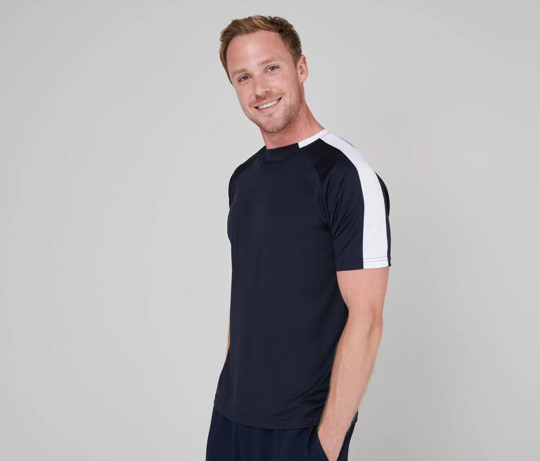 Manches raglan. Col en 2 morceaux. Respirant. Bandes contrastées épaules et manches de 5cm. Coutures propres sans surpiqûres. Double coutures manches et ourlet.